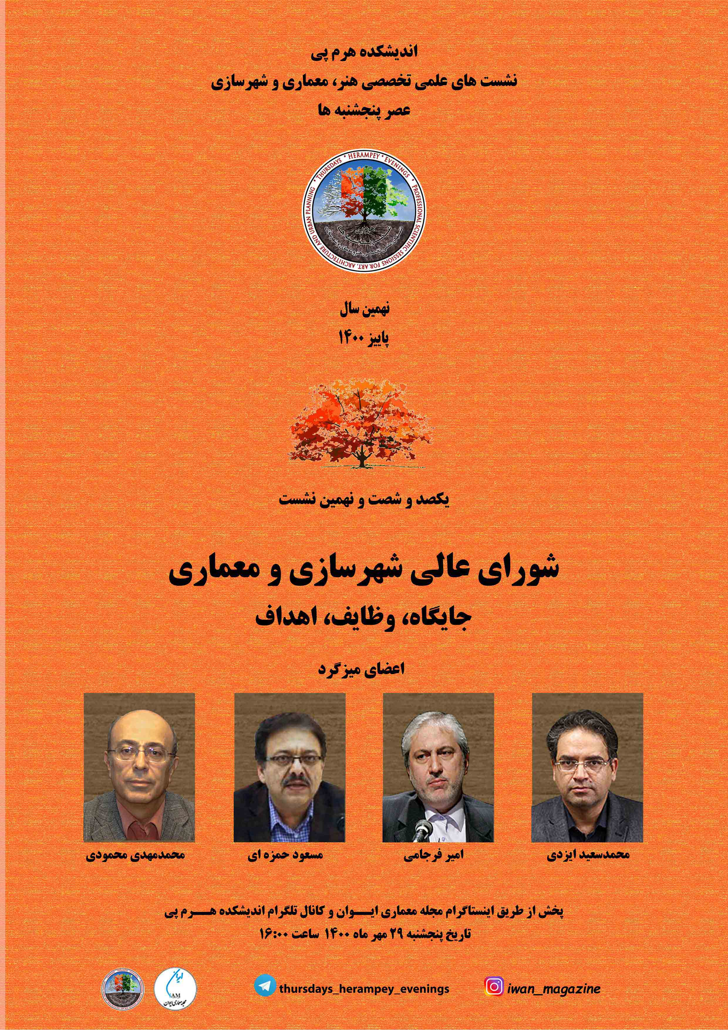 یکصد و شصت و نهمین نشست از سلسله نشست های اندیشکده هرم پی در روز پنجشنبه بیست و نهم مهر ماه 1400 با حضور اساتید این حوزه به صورت مجازی برگزار شد. در این نشست موضوعِ شورای عالی شهرسازی و معماری (جایگاه، وظایف، اهداف) مورد بررسی و تحلیل قرار گرفت.
