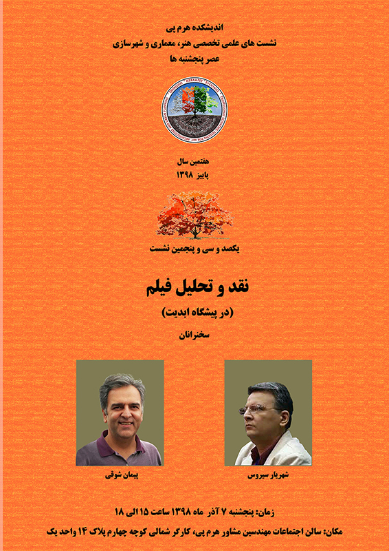صد و سی و پنجمین نشست از سلسله نشست های علمی تخصصی عصر پنجشنبه اندیشکده هرم پی به موضوع نقد و تحلیل فیلم (در پیشگاه ابدیت) اختصاص یافت. در این نشست با حضور اساتید و متخصصین این حوزه به تحلیل و بررسی موضوع مذکور پرداخته شد.