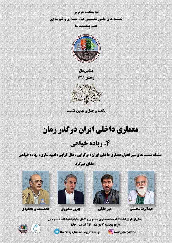 صد و چهل و نهمین نشست از سلسله نشست های علمی تخصصی عصر پنجشنبه اندیشکده هرم پی چهارمین و آخرین میزگرد تخصصی معماری داخلی ایران در گذر زمان با عنوان زیاده خواهی بود. در این نشست که به صورت مجازی برگزار شد اساتید و متخصصین این حوزه به تحلیل و بررسی موضوع پرداختند.