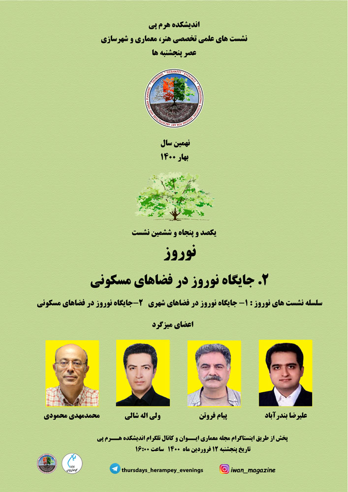 صد و پنجاه و ششمین نشست از سلسله نشست های علمی تخصصی عصر پنجشنبه اندیشکده هرم پی دومین میزگرد تخصصی نوروز با عنوان جایگاه نوروز در فضاهای مسکونی بود. در این نشست که به صورت مجازی برگزار شد با حضور اساتید و متخصصین این حوزه موضوع مذکور مورد تحلیل و بررسی قرار گرفت.