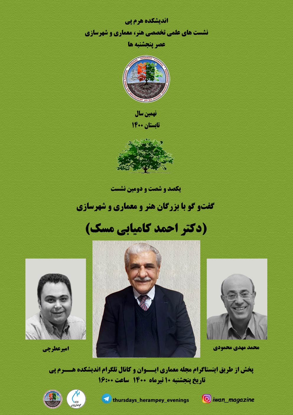 یکصد و شصت و دومین نشست از سلسله نشست های علمی تخصصی عصر پنجشنبه اندیشکده هرم پی به موضوع گفت‌و گو با بزرگان هنر و معماری و شهرسازی اختصاص یافت. در این نشست مجازی با حضور اساتید و متخصصین این حوزه به گفت‌و گو با دکتر احمد کامیابی مسک پرداخته شد.