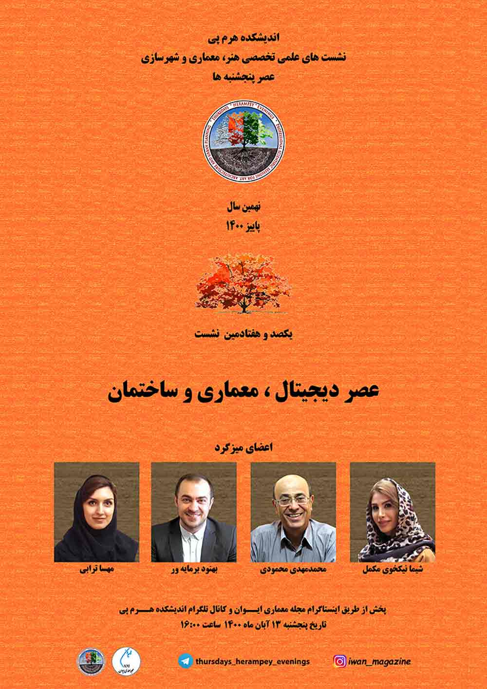 یکصد و هفتادمین نشست از نشست های اندیشکده هرم پی در سیزدهم آبان ماه 1400 با حضور اساتید این حوزه به صورت مجازی برگزار شد. در این نشست موضوع عصر دیجیتال معماری و ساختمان مورد بررسی و تحلیل قرار گرفت.
