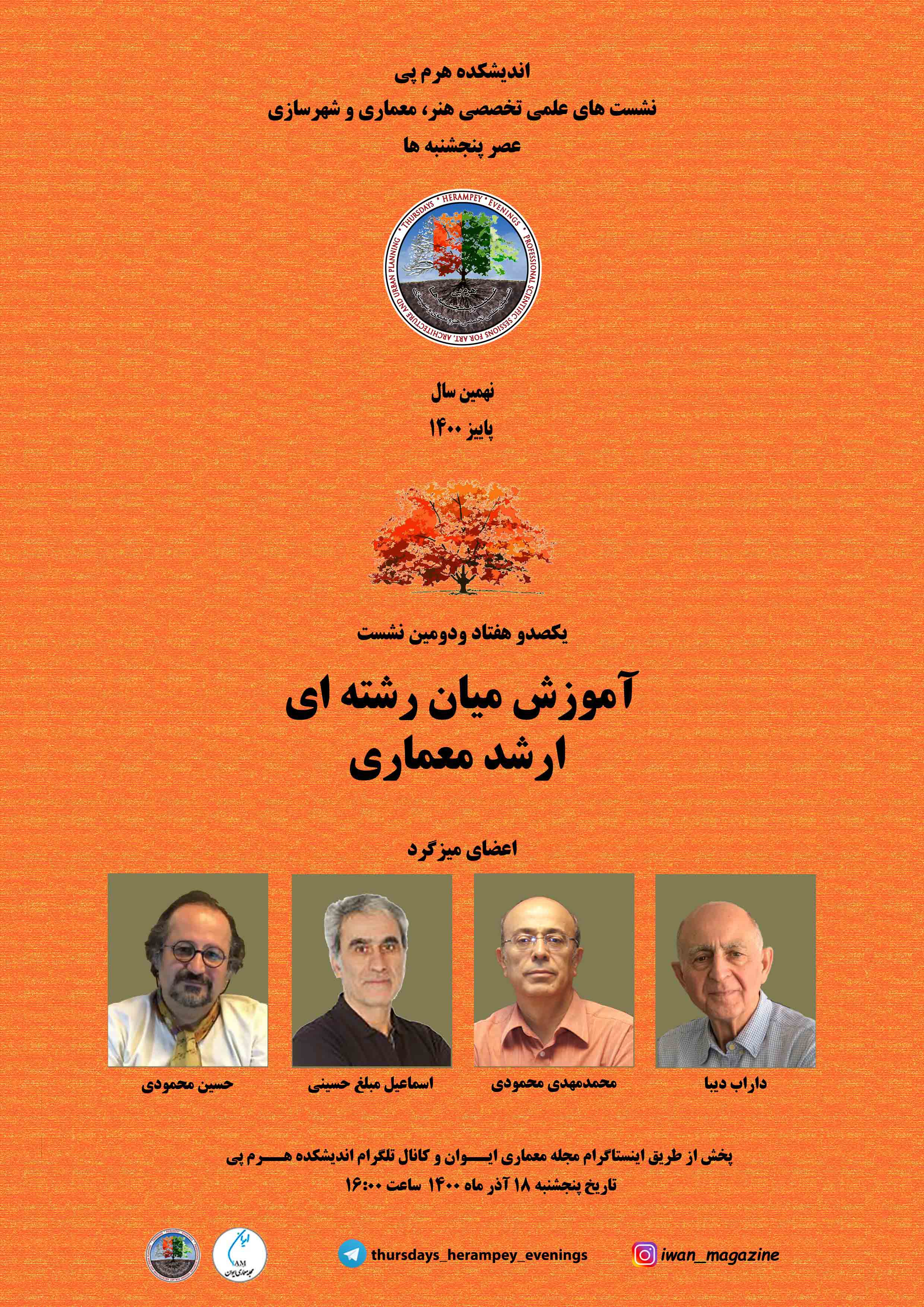 یکصد و هفتاد و یکمین نشست از نشست های اندیشکده هرم پی در هجدهم آذر ماه 1400 با حضور اساتید این حوزه به صورت مجازی برگزار شد. در این نشست موضوع آموزش بین رشته ای ارشد معماری مورد بررسی و تحلیل قرار گرفت.